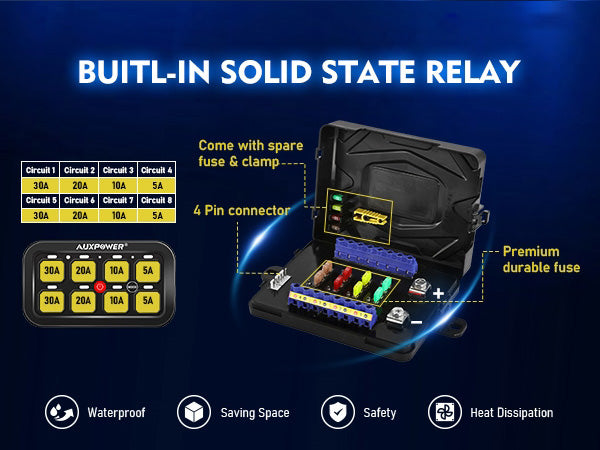 The Auxpower switch panel has 3 utility functions: Toggle, Momentary, and Pulsed (strobe mode). The memory function can keep your settings and help you quickly open the devices.