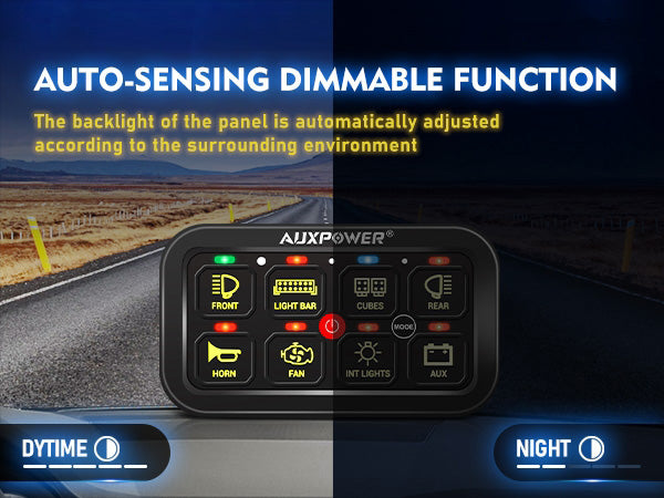 The Auxpower switch has an auto sensing dimming function for a better and safer driving experience. The backlighting automatically adjusts according to the surrounding light environment. When your car drives into a tunnel, it will automatically dim according to the light. You can also manually control the backlight on/off by using the "Mode" button.