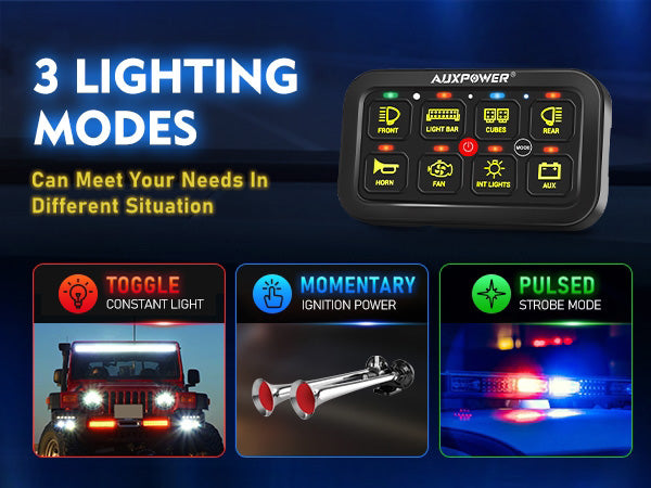 The Auxpower switch panel has 3 utility functions: Toggle, Momentary, and Pulsed (strobe mode). The memory function can keep your settings and help you quickly open the devices.